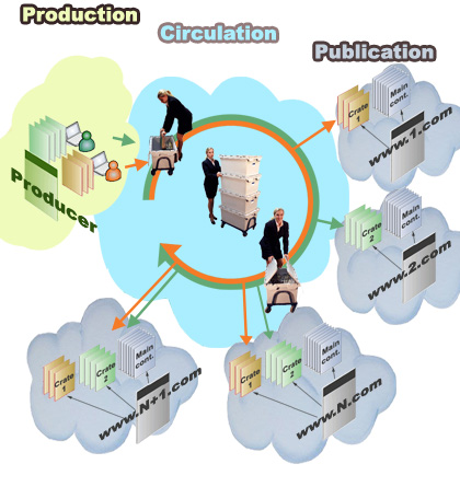 Our web mass production system  simultaneously publish media reach content on preselected set (cloud) of sites. It simulates the process of production and circulation of  newspaper, and in doing so,